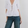 In a cream knitted fabric, the Lynetta top features short sleeves, crew neckline with collar and button up front.