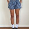 Low rise hot pant with all over shirring detail, Ritala feature an elasticated waist and frill along the hem, cut in a dark blue tartan lycra.