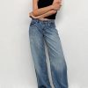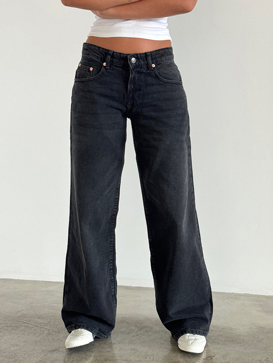 Your favourite Roomy jeans in a washed black rigid denim. Featuring a low rise, oversized fit, floor length, wide legs with a clean hem and a branded back tab, buttons and rivets. Complete with zip fastening.