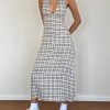 The Galuh smock dress in mini brown gingham, features a loose tiered fit with crew neckline and sleeveless design. Midi length hem, complete with button fastenings down the front.