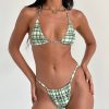 Halterneck triangle bikini top with adjustable ties at neck and at back in a green and white repeat check cut from stretch swim spandex made from recycled materials.